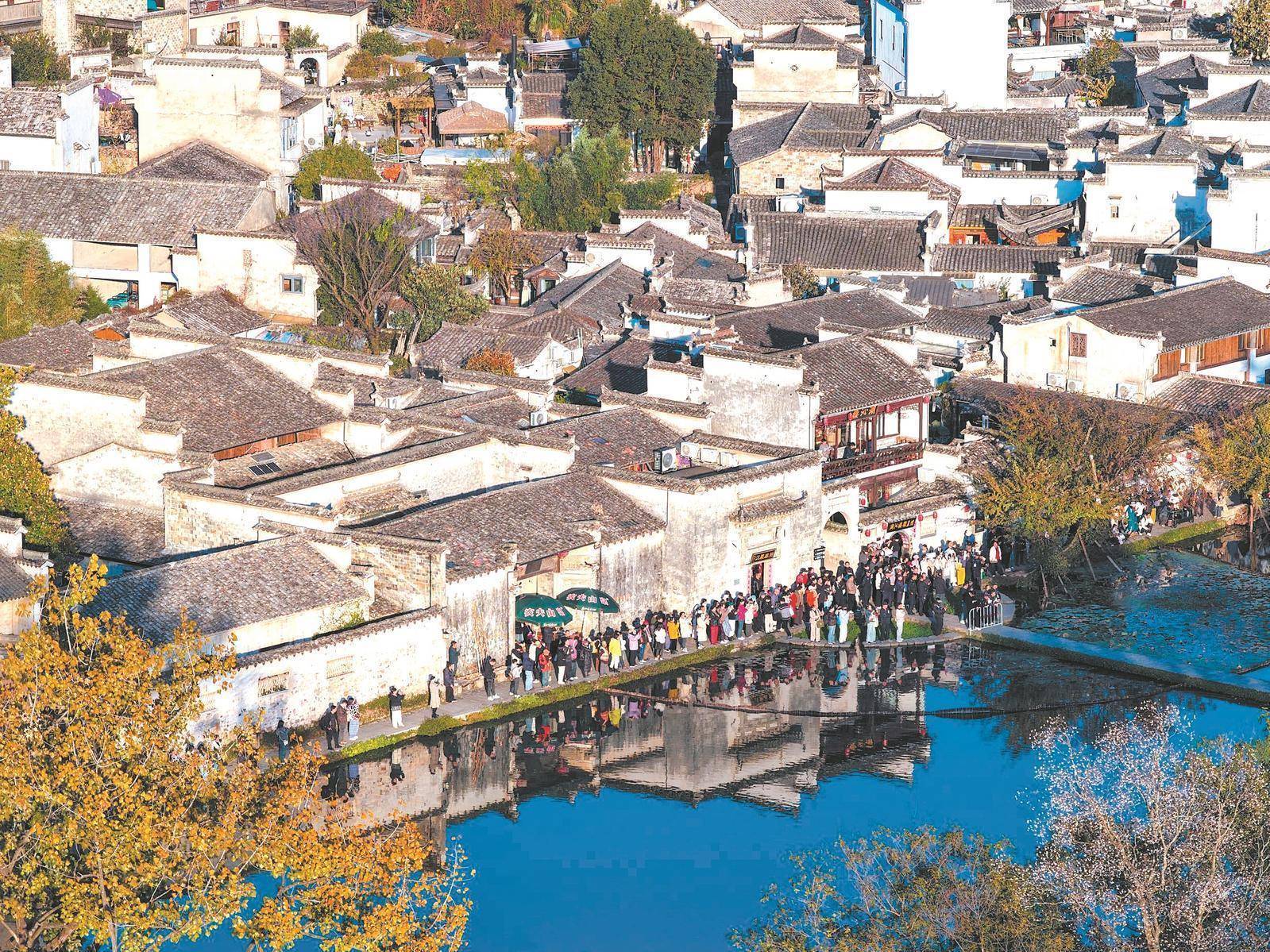 11月21日航拍的宏村。冬日里位于黄山市黟县的世界文化遗产地宏村色彩斑斓,犹如画里乡村。本报记者 徐旻昊 摄