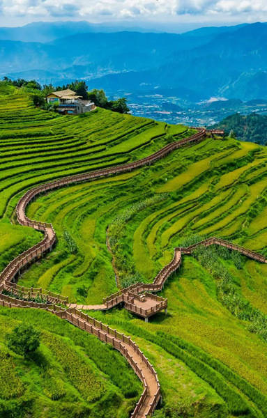 “我们的祖先用木犁开垦这些‘天梯’,现在我们要让全世界看见它的美。”村支书文清菲介绍,新山村争取2.3亿元资金建设的栈道系统,既保护了原始农耕肌理,又让游客能深入田垄体验“云上农耕”。这种“保护性开发”让千年梯田首次获得4A级景区认证,梯田红米入选四川省农村生产生活遗产名录。