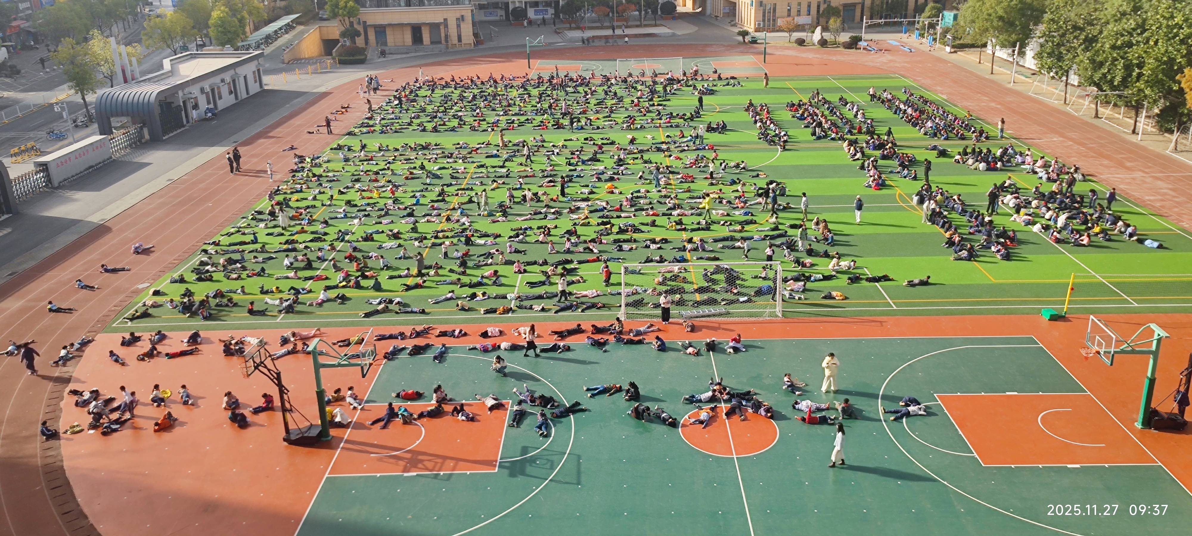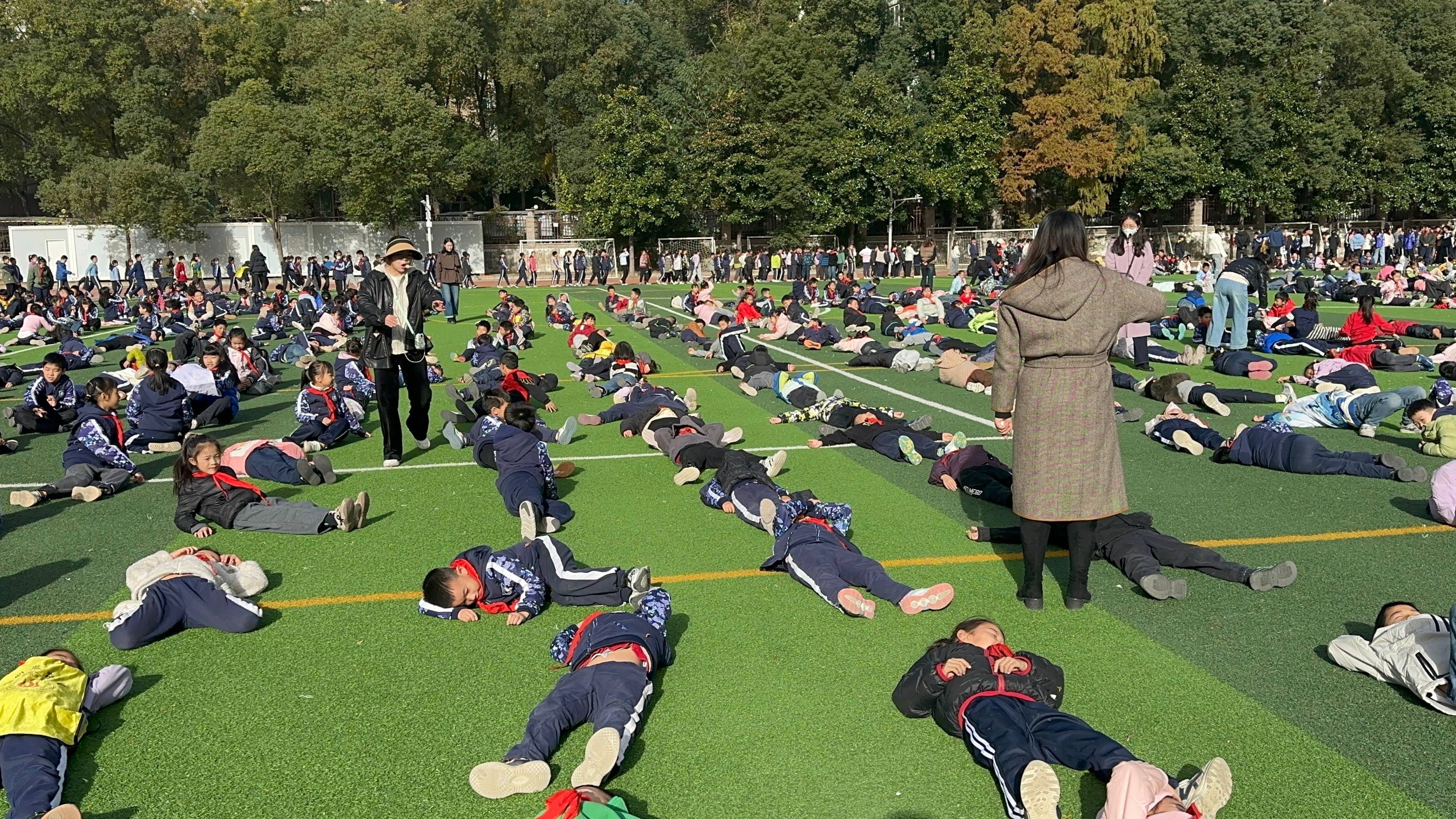 11月27日上午,阳光和煦,武汉一学校操场秒变大型“晒娃”现场,学生们齐刷刷地躺下享受“日光浴”,场面十分壮观。
